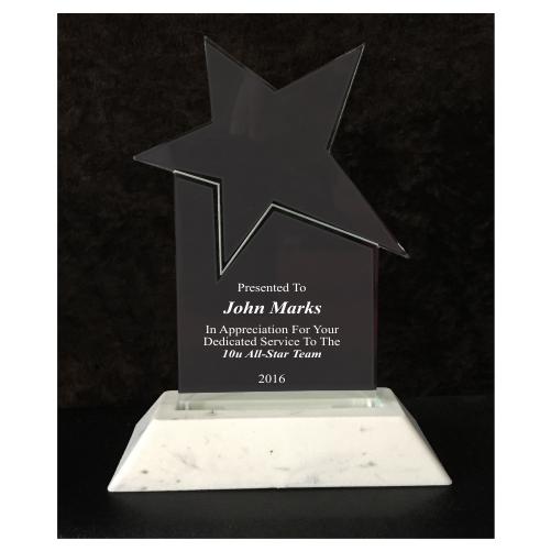 6" Star Pop-In Acrylic This is a 6" tall star acrylic with a white plastic base. The acrylic is 3/8" thick. This acrylic is great for all needs. Your custom logo can be added at no extra charge.